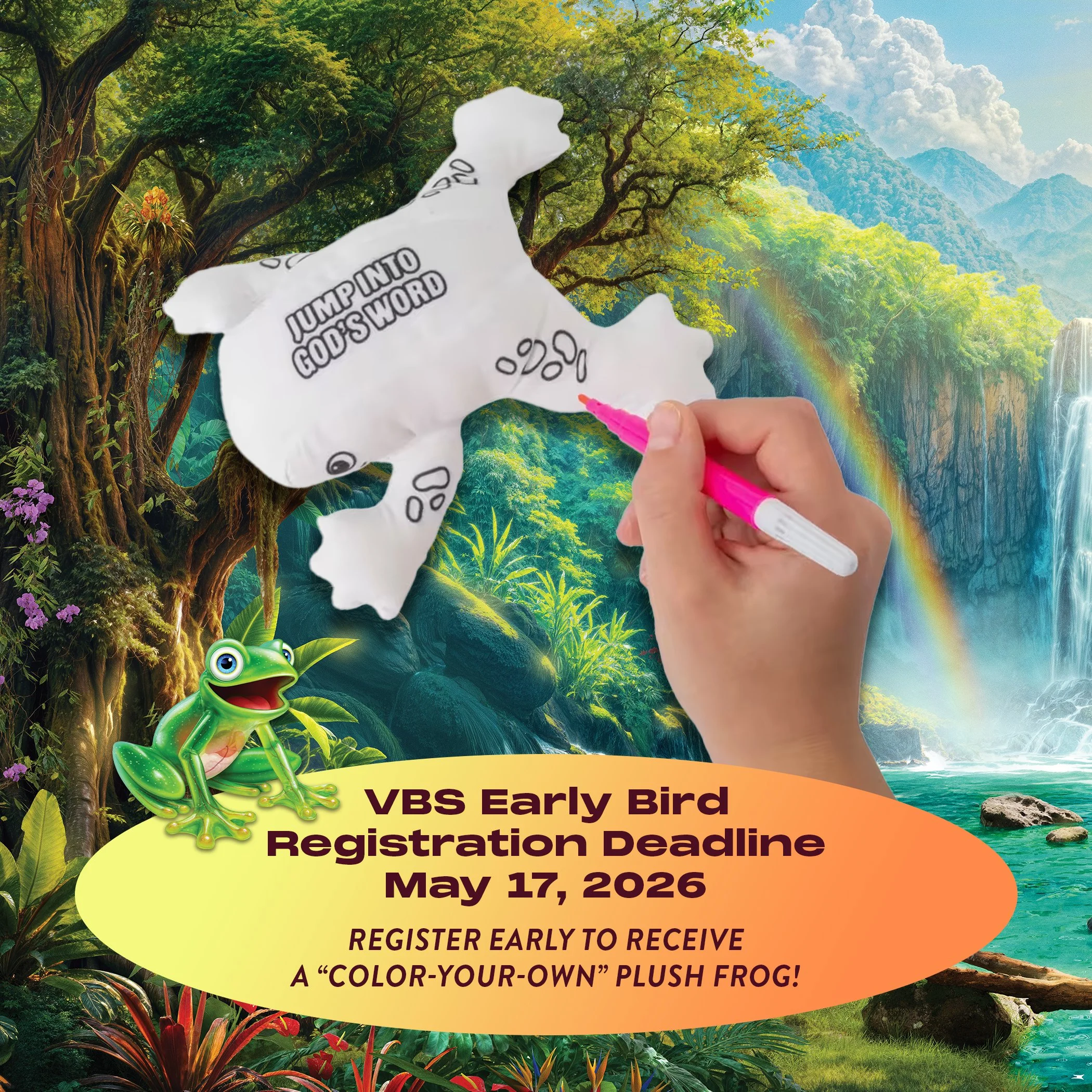 Register by May 17, 2026, for our Early Bird Special, and your child will receive a "Color-Your-Own” Plush Frog, a creative, colorful reminder of just how magnificent God's creation truly is!